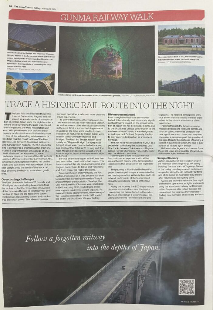 このたび、英字新聞「The Japan Times」にて、群馬県安中市の廃線跡を舞台にしたナイトウォーク体験